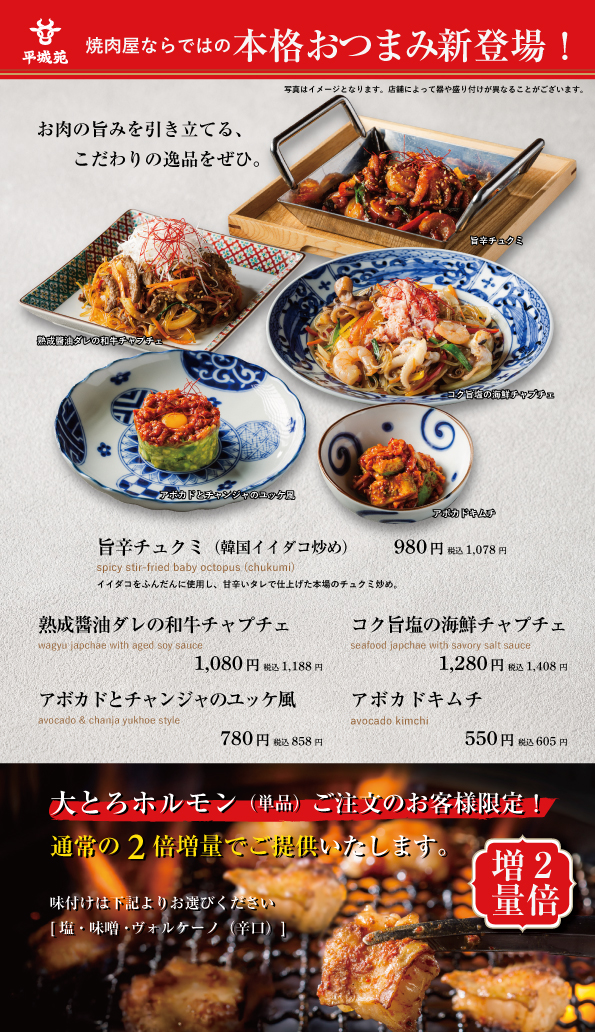『焼肉 平城苑』焼肉屋ならではの本格おつまみ新登場!&ホルモン2倍増量キャンペーン!